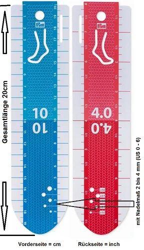 Der Strickfortschritt kann dabei jederzeit ganz einfach überprüft werden. Das Socken-Strick-Lineal aus flexiblem Kunststoff ist leicht und erlaubt ein präzises Messen sowohl in Zentimetern als auch in Inch. Das Nadelmaß umfasst die für das Sockenstricken gängigen Stärken von 2,0 mm bis 4,0 mm bzw. US-Stärken von 0 bis 6. Durch seine handliche Länge von 20 cm lässt sich dieser nützliche Helfer bequem zusammen mit dem Nadelspiel verstauen.