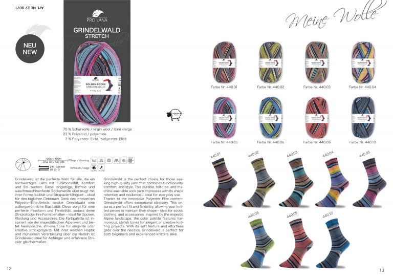 Grindelwald ist die perfekte Wahl für alle, die ein hochwertiges Garn mit Funktionalität, Komfort und Stil suchen. Diese langlebige, filzfreie und waschmaschinenfeste Sockenwolle überzeugt mit ihrer Formstabilität und Strapazierfähigkeit – ideal für den täglichen Gebrauch. Dank des innovativen Polyester-Elite-Anteils besitzt Grindelwald eine außergewöhnliche Elastizität. Diese sorgt für eine perfekte Passform und Flexibilität, sodass deine Strickstücke ihre Form behalten – ideal für Socken, Kleidung und Accessoires. Die Farbpalette ist inspiriert von der majestätischen Alpenwelt und bietet harmonische, stilvolle Töne für elegante oder kreative Strickprojekte.